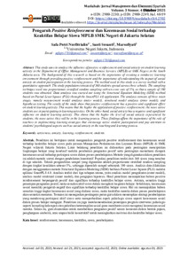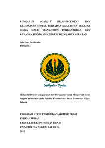 Safa Putri Nurfitrialin, 1709621004. Pengaruh Positive Reinforcement dan Kecemasan Sosial Terhadap Keaktifan Belajar Siswa MPLB SMK Negeri di Jakarta Selatan. Skripsi Jakarta: Program Studi S1 Pendidikan Administrasi Perkantoran, Fakultas Ekonomi dan Bisnis, Universitas Negeri Jakarta, Juli 2025. Penelitian ini dilakukan dengan tujuan untuk mengetahui pengaruh Positive Reinforcement dan Kecemasan Sosial terhadap Keaktifan Belajar Siswa MPLB SMK Negeri di Jakarta Selatan. Penelitian ini menggunakan metode survei dengan pendekatan kuantitatif. Populasi dalam penelitian ini adalah siswa dengan program keahlian Manajemen Perkantoran dan Layanan Bisnis di SMK Negeri di Jakarta Selatan yang berjumlah 360 siswa. Teknik pengambilan sampel menggunakan teknik proportionate stratified random sampling dengan tingkat akurasi kesulitan 5% sehingga didapatkan jumlah sampel 190 siswa. Teknik analisis yang digunakan dalam penelitian ini menggunakan SEM PLS (Structural Equation Modeling - Partial Least Squares) yang dilakukan menggunakan aplikasi SmartPLS 4.0. Selanjutnya teknik analisis data yang dilakukan dalam penelitian ini terdiri dari analisis model pengukuran, analisis model struktural, dan pengujian hipotesis pengaruh langsung. Penelitian ini mendapatkan hasil temuan adanya pengaruh positif dan signifikan antara Positive Reinforcement terhadap Keaktifan Belajar dan adanya pengaruh negatif dan signifikan antara Kecemasan Sosial terhadap Keaktifan Belajar. Kata Kunci: Positive Reinforcement, Kecemasan Sosial, Keaktifan Belajar