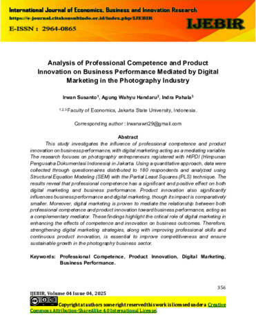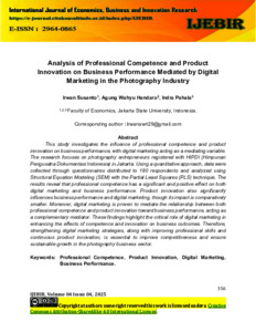 Penelitii an ini bertujui an untuk mengi ani alisis pengi aruh kompetensi profesi di an inovi asi produk terhi adiap kinerji a bisnis, serti a peri an medii asi digiti al mi arketing pi adi a industri fotogri afi. Objek penelitii an i adi ali ah peli aku usi ahi a fotogriafi yi ang tergiabung di ali am Himpuni an Pengusi ahi a Dokumenti asi Indonesii a (HIPDI) di Koti a Ji aki arti a. Penelitii an ini mengguni aki an pendeki ati an kui antiti atif dengian metode survei, melibi atki an 180 responden, di an dii anialisis mengguni aki an teknik Structuri al Equi ation Modeling Pi artii al Leiast Squi are (SEM-PLS). Hi asil penelitii an menunjukki an bi ahwi a kompetensi profesi berpengi aruh signifiki an terhi adi ap kinerji a bisnis, bi aik seci ari a li angsung mi aupun meli alui digiti al mi arketing sebi agi ai vi ariiabel medii asi. Inovi asi produk jugi a berpengi aruh signifiki an terhi adiap kinerji a bisnis, dengi an digiti al mi arketing berperian sebiagi ai medii ator piarsii al. Digiti al mi arketing memiliki pengi aruh signifiki an terhi adi ap peningki ati an kinerji a bisnis, meskipun dengi an tingki at pengi aruh yi ang lebih rendi ah dibi andingki an kompetensi profesi di an inoviasi produk. Medii asi digiti al mi arketing bersifi at complementi ary medii ation, i artinyi a pengi aruh liangsung di an tidi ak li angsung si aling melengki api. Temui an ini mengindiki asiki an bi ahwi a pengui ati an kompetensi profesi, peningki ati an inoviasi produk, di an optimi alisi asi digiti al mi arketing seci ari a bersiami a-si ami a mi ampu meningki atki an di ayi a si aing di an kinerji a bisnis fotogri afer, khususnyi a di ali am menghi adiapi ti anti angi an pi asiar digiti al. Penelitii an ini memberiki an impliki asi teoritis terki ait perian penting sumber di ayi a mi anusii a di an teknologi digiti al di ali am industri kreiatif, serti a impliki asi pri aktis biagi UMKM fotogri afi di ali am striategi pengembi angi an bisnis berkeli anjuti an. Ki ati a Kunci: Kompetensi Profesi, Inovi asi Produk, Digiti al Mi arketing, Kinerji a Bisnis.