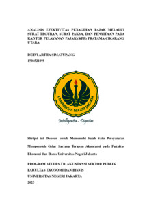 DELVI ARTHA SIMATUPANG. Analisis Efektivitas Penagihan Pajak melalui Surat Teguran, Surat Paksa, hingga Penyitaan pada Kantor Pelayanan Pajak (KPP) Pratama Cikarang Utara. Skripsi, Fakultas Ekonomi dan Bisnis, Universitas Negeri Jakarta, 2025. Penelitian ini bertujuan untuk mengetahui efektivitas penagihan pajak melalui surat teguran, surat paksa, hingga penyitaan serta kendala yang dihadapi oleh para fiskus dalam menangani penagihan pajak. Penelitian ini menggunakan jenis penelitian kualitatif dan pendekatan studi kasus lapangan dan menggunakan data primer dan sekunder. Berdasarkan hasil analisis yang telah dilakukan dapat disimpulkan bahwa penagihan pajak dengan surat teguran, surat paksa, hingga penyitaan pada KPP Pratama Cikarang Utara dari tahun 2021 sampai dengan tahun 2023 masih tergolong tidak efektif. Namun, penagihan pajak pada tahun 2021 melalui surat paksa tergolong efektif hal tersebut dikarenakan adanya insentif pajak yang diberikan oleh pemerintah dikarenakan terjadinya COVID-19. Penagihan pajak yang tidak efektif terjadi karena wajib pajak yang tidak kooperatif dan tidak beritikad baik sehingga wajib pajak sering menghindar dari pelaksanaan penagihan pajak. Selain itu kendala yang dihadapi oleh para fiskus adalah kurangnya SDM yang belum memadai dan terjadinya error system yang membuat besar tunggakan yang harus ditagih tidak sesuai dengan jumlah yang sudah dibayar. Kata Kunci: Penagihan Pajak dengan Surat Teguran, Surat Paksa hingga penyitaan, efektivitas, tunggakan pajak