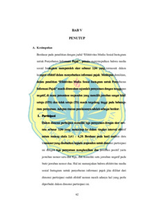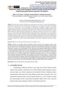 DIAN AYU LESTARI, Efektivitas Media Sosial Instagram untuk Penyebaran Informasi Pajak (Studi Kasus Pekerja Generasi Z di Jakarta). Skripsi, DKI Jakarta: Program Studi Pemasaran Digital, Fakultas Ekonomi dan Bisnis, Universitas Negeri Jakarta. Tim Pembimbing: Agung Kresnamurti Rivai P., ST., M.M dan Nofriska Krissanya, S.E., M.B.A Penelitian ini bertujuan untuk menganalisis efektivitas media sosial Instagram untuk penyebaran informasi pajak pada pekerja generasi Z di Jakarta. Di era digitalisasi saat ini telah banyak mengubah aspek kehidupan, termasuk cara masyarakat mengakses dan mendapatkan informasi, hal itu menjadi sebuah tantangan tersendiri untuk akun-akun yang menyebarkan informasinya melalui media sosial Instagram. Penelitian ini menggunakan pendekatan kuantitatif yang bersifat deskriptif dengan menerapkan metode survei, dimana data dikumpulkan melalui kuesioner yang disebarkan kepada 96 responden yang merupakan para pekerja generasi Z yang berdomisili di Jakarta serta aktif memainkan media sosial Instagram dan pernah mengakses konten pajak. Data yang terkumpul dianalisis menggunakan bantuan sofware SPSS (Stastical Program for Social Sciene). Hasil analisis menunjukan bahwa media sosial Instagram efektif dalam penyebaran informasi pajak bagi pekerja generasi Z di Jakarta yng dilihat dari sisi partisipasi, keterbukaan, percakapan, masyarakat, dan keterhubungan. Penelitian ini dapat menjadi wawasan untuk akun-akun di media sosial Instagram yang ingin mengoptimalkan penyebaran informasinya melalui konten yang diupload kepada para audiens. Kata Kunci: Efektivitas, Media Sosial Instagram, Penyebaran Informasi, Pajak