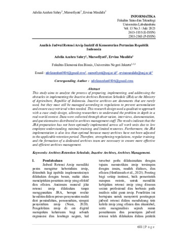 Adelia Azahra Sahry. 2025. 1703521048. Analisis Jadwal Retensi Arsip Inaktif di Kementerian Pertanian Republik Indonesia. Program Studi D4 Administrasi Perkantoran Digital, Fakultas Ekonomi dan Bisnis, Universitas Negeri Jakarta. Penelitian ini dilakukan untuk mengevaluasi tahapan penyusunan, pelaksanaan, dan mengidentifikasi kendala dalam penerapan Jadwal Retensi Arsip Inaktif (JRA) di Kementerian Pertanian Republik Indonesia. Arsip inaktif merupakan dokumen yang jarang digunakan, namun tetap perlu dikelola secara sistematis agar tidak terjadi penumpukan dan tetap mudah diakses saat dibutuhkan. Penelitian ini menggunakan pendekatan kualitatif dengan desain studi kasus, sehingga memungkinkan peneliti memahami permasalahan secara komprehensif dalam konteks dunia nyata. Teknik pengumpulan data dilakukan melalui observasi lapangan, wawancara mendalam, telaah dokumentasi, dan penyebaran kuesioner kepada petugas yang menangani kearsipan. Hasil penelitian menunjukkan bahwa penyusunan JRA belum terlaksana secara komprehensif di seluruh unit kerja, dikarenakan pemahaman pegawai yang masih rendah, pelatihan yang terbatas, dan kurangnya sarana pendukung. Selain itu, pelaksanaan JRA belum optimal karena masih terdapat arsip yang belum terklasifikasi sesuai ketentuan masa retensi yang berlaku. Oleh karena itu, penguatan kebijakan internal, peningkatan kapasitas melalui pelatihan, dan pembentukan tim kearsipan sangat diperlukan untuk mendukung pengelolaan kearsipan yang tertib dan efisien. Kata Kunci: Jadwal Retensi Arsip, Arsip Inaktif, Pengelolaan Arsip