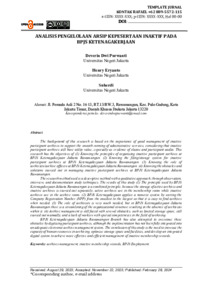 DEVERIN DWI PURWANTI.2025.1703521052.Analisis Pengelolaan Arsip Kepesertaan Inaktif Pada BPJS Ketenagakerjaan Jakarta Rawamangun. Program Studi D4 Administrasi Perkantoran Digital, Fakultas Ekonomi dan Bisnis, Universitas Negeri Jakarta. Latar belakang penelitian ini didasarkan pada pentingnya pengelolaan arsip kepesertaan inaktif yang baik untuk menunjang kelancaran pelayanan administrasi, mengingat arsip kepesertaan inaktif masih memiliki nilai guna terutama sebagai bukti klaim dan audit kepesertaan. Penelitian ini memiliki tujuan (1) Mengetahui asas pengorganisasian arsip kepesertaan inaktif pada BPJS Ketenagakerjaan Jakarta Rawamangun. (2) Mengetahui sistem filing/penyimpanan arsip kepesertaan inaktif pada BPJS Ketenagakerjaan Jakarta Rawamangun. (3) Mengetahui peran arsiparis/petugas arsip pada BPJS Ketenagakerjaan Jakarta Rawamangun. (4) Mengetahui hambatan dan solusi yang dilakukan dalam pengelolaan arsip kepesertaan inaktif pada BPJS Ketenagakerjaan Jakarta Rawamangun. Metode penelitian yang digunakan adalah metode deskriptif dengan pendekatan kualitatif, melalui teknik observasi, wawancara, dan studi dokumentasi. Hasil dari penelitian ini (1) Asas yang digunakan oleh BPJS Ketenagakerjaan Jakarta Rawamangun adalah asas gabungan, karena penyimpanan arsip aktif dan arsip inaktif dilakukan secara terpisah, arsip aktif berada pada ruangan kepesertaan sedangkan arsip inaktif berada pada ruang arsip. (2) BPJS Ketenagakerjaan menerapkan sistem numerik dengan mengurutkan Nomor Pendaftaran Perusahaan (NPP) dari yang terkecil sampai yang terbesar sehingga memudahkan penemuan kembali arsip saat diperlukan. (3) Peran dari arsiparis sangat dibutuhkan namun pada BPJS Ketenagakerjaan Jakarta Rawamangun terjadi perampingan struktir organisasi sehingga menyebabkan ketiadaan tenaga arsiparis didalamnya. (4) Pengelolaan arsip masih dihadapkan pada beberapa kendala, seperti keterbatasan ruang penyimpanan, masih dilakukannya proses secara manual, serta kurangnya tenaga kerja dengan kompetensi khusus di bidang kearsipan. BPJS Ketenagakerjaan Cabang Jakarta Rawamangun juga telah berupaya mengatasi kendala tersebut dengan melakukan digitalisasi arsip kepesertaan, meskipun implementasinya belum sepenuhnya terintegrasi dalam sistem pengelolaan arsip elektronik yang memadai. Kesimpulan dari penelitian ini adalah diperlukan peningkatan kapasitas SDM kearsipan, optimalisasi ruang dan sarana penyimpanan, serta pengembangan sistem digital terintegrasi guna mewujudkan pengelolaan arsip kepesertaan inaktif yang lebih efektif dan efisien. Kata Kunci: pengelolaan arsip, arsip kepesertaan inaktif, bpjs ketenagakerjaan.