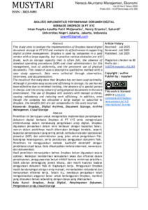 Intan Puspita Ayudita Putri Widjanarko, 2025. 1703521066. Analisis Implementasi Penyimpanan Dokumen Digital Berbasis Dropbox di PT XYZ. Program Studi Sarjana Terapan Administrasi Perkantoran Digital, Fakultas Ekonomi dan Bisnis, Universitas Negeri Jakarta. Penelitian ini bertujuan untuk menganalisis implementasi penyimpanan dokumen digital berbasis Dropbox di PT XYZ serta mengevaluasi efektivitasnya dalam mendukung pengelolaan arsip digital. Dropbox digunakan perusahaan dalam versi berbayar dengan kapasitas besar, namun dalam praktiknya masih ditemukan berbagai kendala, seperti kapasitas penyimpanan yang sering penuh, ketiadaan standar operasional prosedur (SOP) dan administrator yang jelas untuk pengelolaan file, kurangnya keseragaman, serta persistennya penggunaan dokumen fisik. Penelitian ini menggunakan metode kualitatif deskriptif dengan pendekatan studi kasus. Data dikumpulkan melalui observasi, wawancara dan dokumentasi. Hasil penelitian menunjukkan bahwa Dropbox belum digunakan secara optimal. Meskipun memberikan kemudahan akses dan efisiensi dalam penyimpanan, penggunaannya belum efektif karena minimnya pelatihan, tidak adanya penanggung jawab khusus, dan masih kuatnya budaya penggunaan dokumen fisik di lingkungan kerja. Penggunaan Dropbox masih berdampingan dengan arsip manual, menyebabkan redundansi dan menurunkan efisiensi kerja. Selain itu, meskipun perusahaan telah mengalokasikan anggaran besar untuk berlangganan Dropbox, manfaat yang dirasakan belum sebanding dengan biaya yang dikeluarkan. Kata Kunci: Dropbox, Arsip Digital, Penyimpanan Dokumen, Pengelolaan arsip Cloud Storage