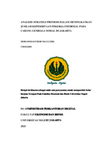 Mohammad Fikri Mauludin. 2025. 1703521058. Analisis Strategi Promosi Dalam Meningkatkan Jumlah Kepesertaan Pekerja Informal Pada Salah Satu Cabang Lembaga Sosial Di Jakarta. Program Studi D4 Administrasi Perkantoran Digital, Fakultas Ekonomi dan Bisnis, Universitas Negeri Jakarta. Penelitian ini bertujuan untuk menganalisis strategi promosi yang diterapkan oleh salah satu cabang lembaga sosial di Jakarta dalam meningkatkan kepesertaan pekerja sektor informal, mengidentifikasi kendala yang dihadapi, serta merumuskan solusi yang relevan. Penelitian menggunakan pendekatan kualitatif deskriptif dengan metode studi kasus. Informan terdiri dari tiga supervisor kepesertaan dan satu kepala bidang kepesertaan yang dipilih karena memiliki keterlibatan langsung dalam pelaksanaan promosi. Teknik pengumpulan data dilakukan melalui wawancara mendalam, observasi lapangan, dan dokumentasi. Proses analisis dibantu oleh aplikasi NVivo 12 Plus untuk mengidentifikasi tema dan menyusun data secara sistematis. Hasil penelitian menunjukkan bahwa strategi promosi yang diterapkan merupakan kombinasi strategi tarik dan dorong. Strategi tarik dilakukan melalui media digital seperti WhatsApp Group, Instagram, situs resmi, dan berita online. Strategi dorong dilaksanakan melalui sosialisasi langsung dilapangan dan kerja sama dengan tokoh masyarakat serta komunitas lokal. Strategi ini dinilai cukup efektif dalam menjangkau pekerja informal dan membangun komunikasi dua arah. Namun, pelaksanaannya masih menghadapi berbagai kendala, baik eksternal maupun internal. Kendala eksternal meliputi rendahnya pemahaman masyarakat tentang manfaat program serta keterbatasan waktu pekerja informal untuk mengikuti kegiatan promosi. Kendala internal mencakup keterbatasan tenaga, waktu, anggaran, serta penggunaan bahasa promosi yang terlalu teknis. Solusi yang disarankan mencakup penguatan sosialisasi tatap muka, penyederhanaan bahasa promosi, penggunaan media visual seperti video pendek dan testimoni peserta, serta peningkatan kolaborasi dengan tokoh masyarakat. Penelitian ini diharapkan menjadi referensi praktis bagi lembaga sosial dalam menyusun strategi promosi yang adaptif, komunikatif, dan kolaboratif guna meningkatkan partisipasi pekerja informal dalam program jaminan sosial ketenagakerjaan. Kata Kunci: strategi promosi, pekerja informal, lembaga sosial, kepesert