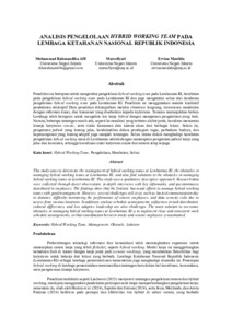 Muhammad Rahmandika Afif. 2025. 1703521034. Analisis Pengelolaan Hybrid Working Team Pada Lembaga Ketahanan Nasional Republik Indonesia. Program Studi D4 Administrasi Perkantoran Digital, Fakultas Ekonomi dan Bisnis, Universitas Negeri Jakarta Penelitian ini bertujuan untuk mengetahui pengelolaan hybrid working team pada Lemhannas RI, hambatan pada pengelolaan hybrid working team pada Lemhannas RI dan juga mengetahui solusi dari hambatan pengelolaan hybrid working team pada Lemhannas RI. Penelitian ini menggunakan metode kualitatif pendekatan deskriptif Data penelitian dikumpulkan melalui observasi langsung, wawancara mendalam dengan informan kunci, dan kuesioner yang disebarkan kepada karyawan. Temuan menunjukkan bahwa Lembaga telah berupaya untuk mengelola tim kerja hybrid dengan manajemen pengelolaan yang baik. Namun, beberapa tantangan masih ada, seperti komunikasi yang terbatas akibat jarak, kesulitan memantau kinerja karyawan remote, serta risiko keamanan data karena akses dari berbagai lokasi. Selain itu, pengaturan jadwal yang kurang jelas, ketidakadilan dalam pembagian tugas, perbedaan budaya, dan kepemimpinan yang kurang adaptif juga menjadi tantangan. Solusi utama dalam menghadapi hambatan pengelolaan hybrid working team di Lemhannas adalah dengan menerapkan pengaturan jadwal kerja yang jelas dan konsisten, sehingga koordinasi antar karyawan onsite dan remote tetap terjaga. Kata Kunci: Hybrid Working Team, Pengelolaan, Hambatan, Solusi