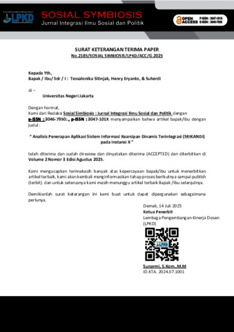 TESSALONIKA SITINJAK. 2025. 1703521043. Analisis Penerapan Aplikasi Sistem Informasi Kearsipan Dinamis Terintegrasi (SRIKANDI) pada Badan Keamanan Laut RI. Program Studi D4 Administrasi Perkantoran Digital, Fakultas Ekonomi dan Bisnis, Universitas Negeri Jakarta. Penelitian ini merupakan penelitian kualitatif dengan pendeketan studi kasus. Pengumpulan data dilakukan melalui data primer yang terdiri dari observasi, wawancara, dan dokumentasi, serta data sekunder yang berasal dari buku, jurnal akademik, dan artikel. Pengambilan sampel pada penelitian ini menggunakan metode non-probability sampling dengan metode purposive sampling. Tujuan penelitian ini yaitu untuk mengetahui penerapan aplikasi SRIKANDI, kendala apa saja yang dialami dalam penerapan aplikasi SRIKANDI, serta upayaupaya yang dilakukan untuk mengoptimalkan penerapan aplikasi SRIKANDI di lingkungan Badan Keamanan Laut RI. Hasil penelitian ini menunjukkan bahwa penerapan aplikasi SRIKANDI memberikan banyak manfaat dan kemudahan dalam pengelolaan surat dan arsip, serta membuat prosesnya menjadi lebih terstruktur dan mempermudah koordinasi. Akan tetapi masih terdapat kekurangan dalam penerapannya, yaitu kuantitas penggunaan di setiap unit kerja yang masih berbeda, komitmen pimpinan, dan proses konvensional yang masih dilakukan secara bersamaan. Selain itu, kendala yang dialami dalam proses penerapan aplikasi SRIKANDI adalah aplikasi atau server yang sering lambat atau down, belum semua pegawai terampil dalam menggunakan aplikasi, dan keamanan aplikasi yang tidak bisa terjamin 100%. Upaya yang dilakukan untuk mengoptimalkan penerapan aplikasi ini yaitu dengan mengadakan bimtek dan sosialisasi secara berkala, pemberian dukungan dari pimpinan, dan pemberian pendampingan bagi pegawai yang belum terampil. Kata kunci: Aplikasi SRIKANDI, Arsip Digital, SPBE