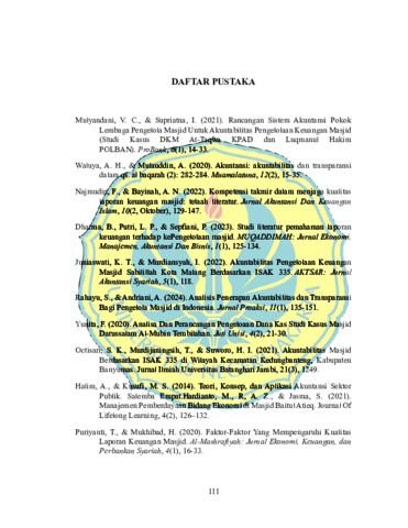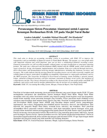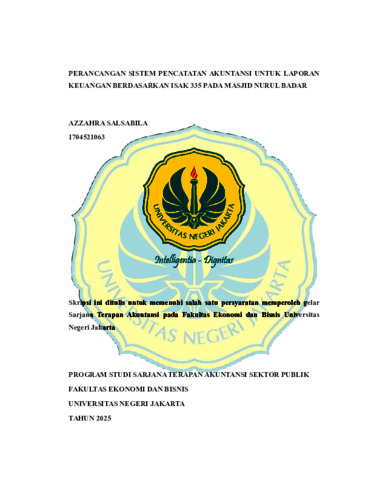 AZZAHRA SALSABILA. Perancangan Sistem Pencatatan Akuntansi untuk Laporan Keuangan Berdasarkan ISAK 335 pada Masjid Nurul Badar. Skripsi. Jakarta: Fakultas Ekonomi dan Bisnis, Universitas Negeri Jakarta, 2025. Penelitian ini bertujuan untuk merancang sistem pencatatan akuntansi yang sesuai dengan standar ISAK 335 guna meningkatkan transparansi dan akuntabilitas laporan keuangan Masjid Nurul Badar. Masjid Nurul Badar merupakan salah satu entitas berorientasi nonlaba yang berperan penting dalam kegiatan sosial dan keagamaan, namun belum memiliki sistem pencatatan keuangan yang terstandar. Proses pencatatan masih dilakukan secara sederhana tanpa klasifikasi akun maupun format laporan yang baku. Penelitian ini menggunakan metode Research and Development (R&D) dengan model ADDIE yang mencakup tahapan analisis, desain, pengembangan, implementasi, dan evaluasi. Pengumpulan data dilakukan melalui wawancara, observasi, dan dokumentasi. Data diperoleh dari pengelola Masjid Nurul Badar, termasuk ketua, sekretaris, dan bendahara. Hasil penelitian menunjukkan bahwa pencatatan transaksi sebelumnya tidak dapat menyajikan laporan keuangan secara utuh, terutama dalam memenuhi tuntutan pertanggungjawaban kepada jamaah dan pihak donatur seperti program BOTI. Peneliti merancang sistem pencatatan berbasis Microsoft Excel yang mencakup jurnal umum, buku besar, laporan posisi keuangan, laporan arus kas, laporan perubahan aset neto, dan laporan penghasilan komprehensif. Sistem ini disesuaikan dengan karakteristik entitas nonlaba dan mengacu pada ketentuan ISAK 335 agar dapat dengan mudah digunakan oleh pengelola masjid yang tidak memiliki latar belakang akuntansi. Kata Kunci: ISAK 335, Sistem Pencatatan Akuntansi, Masjid, Laporan Keuangan, Entitas Nonlaba.