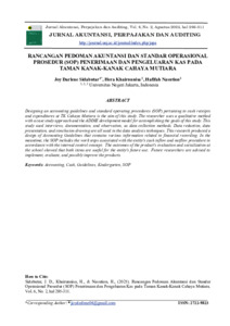 Tujuan dilakukannya penelitian ini adalah untuk merancang Pedoman Akuntansi dan Standar Operasional Prosedur (SOP) terkait penerimaan dan pengeluaran kas pada Taman Kanak-Kanak (TK) Cahaya Mutiara. TK Cahaya Mutiara yang menjadi objek penelitian ini merupakan lembaga pendidikan di bidang anak yang berlokasi di wilayah Jakarta Pusat. Dalam rangka mencapai tujuan penelitian ini maka peneliti menerapkan metode kualitatif dengan pendekatan studi kasus serta model pengembangan ADDIE yang berfokus pada tiga tahapan awal, yakni tahap Analysis, Design, dan Development. Teknik analisis datanya terdiri dari reduksi data, penyajian data, serta penarikan kesimpulan. Penelitian ini menghasilkan suatu buku Pedoman Akuntansi dan SOP terkait penerimaan dan pengeluaran kas pada TK Cahaya Mutiara. Buku Pedoman Akuntansi ini memuat panduan bagi entitas dalam melakukan pencatatan keuangannya, meliputi definisi, pengakuan, pengukuran, penyajian, pengungkapan atas akun aset, liabilitas, penerimaan, dan pengeluaran kas entitas, daftar akun, ilustrasi penjurnalan, serta format penjurnalan secara digital. Sementara itu, buku SOP memuat berbagai langkah kerja terkait proses penerimaan yang berasal dari SPP murid, pendaftaran murid baru, dan dana bantuan dari Pemerintah, serta pengeluaran kas yang selaras dengan konsep pengendalian internal. Hasil produk ini juga telah disosialisasikan dan dievaluasi oleh pihak sekolah, yang di mana hasil evaluasinya menunjukkan bahwa buku Pedoman Akuntansi serta SOP penerimaan dan pengeluaran kas TK Cahaya Mutiara sudah informatif, tampilannya menarik, serta dapat diaplikasikan ke depannya oleh entitas. Penelitian ini merekomendasikan bagi TK untuk mulai menggunakan buku Pedoman Akuntansi dan SOP guna meningkatkan pengelolaan keuangannya menjadi lebih baik. Bagi penelitian selanjutnya, diharapkan dapat melakukan implementasi dalam jangka waktu tertentu, evaluasi, bahkan penyempurnaan produk sehingga produk yang sudah ada menjadi sempurna selaras dengan kebutuhan dan kapabilitas entitas. Selain itu, diharapkan juga dapat melibatkan pandangan dari pihak eksternal dan dapat berfokus pada pembuatan laporan keuangan organisasi. Kata Kunci: Penerimaan Kas, Pengeluaran Kas, Pedoman Akuntansi, Standar Operasional Prosedur (SOP), TK Cahaya Mutiara