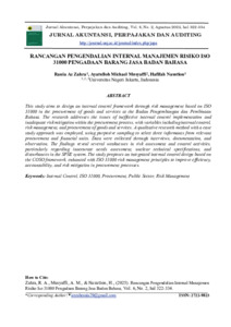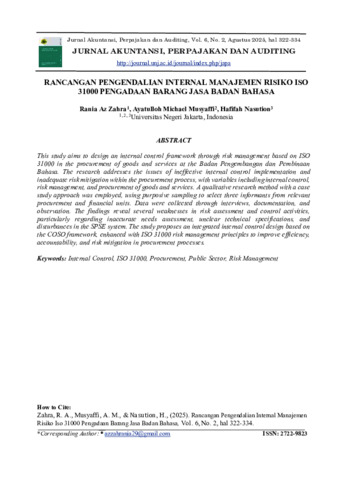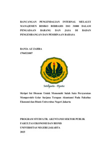 RANIA AZ ZAHRA. Rancangan Pengendalian Internal melalui Manajemen Risiko berbasis ISO 31000 dalam Pengadaan Barang dan Jasa di Badan Pengembangan dan Pembinaan Bahasa. Skripsi, Fakultas Ekonomi, Universitas Negeri Jakarta, 2025. Penelitian ini bertujuan untuk merancang kerangka pengendalian internal melalui manajemen risiko berbasis ISO 31000 dalam pengadaan barang dan jasa di Badan Pengembangan dan Pembinaan Bahasa. Penelitian ini membahas permasalahan terkait lemahnya penerapan pengendalian internal dan kurangnya mitigasi risiko dalam proses pengadaan, dengan variabel yang meliputi pengendalian internal, manajemen risiko, serta pengadaan barang dan jasa. Metode penelitian yang digunakan adalah kualitatif dengan pendekatan studi kasus, menggunakan teknik purposive sampling untuk memilih tiga informan dari unit pengadaan dan keuangan yang relevan. Pengumpulan data dilakukan melalui wawancara, dokumentasi, dan observasi. Temuan penelitian menunjukkan bahwa meskipun sistem pengendalian internal di Badan Bahasa telah mengacu pada komponen-komponen pengendalian internal berbasis COSO, tetapi masih terdapat sejumlah area yang dapat ditingkatkan, seperti pada aspek penilaian risiko dan aktivitas pengendalian. Beberapa isu yang teridentifikasi antara lain ketidakakuratan dalam penyusunan kebutuhan, spesifikasi teknis yang tidak jelas, serta gangguan pada sistem SPSE. Oleh karena itu, penelitian ini mengusulkan rancangan pengendalian internal yang terintegrasi berdasarkan kerangka COSO, yang diperkuat dengan prinsip-prinsip manajemen risiko ISO 31000, guna meningkatkan efisiensi, akuntabilitas, dan mitigasi risiko dalam proses pengadaan. Implikasi dari penelitian ini adalah penerapan manajemen risiko yang terstruktur dan terintegrasi ke dalam kerangka pengendalian internal dapat memberikan dampak positif terhadap peningkatan tata kelola pengadaan barang dan jasa di sektor publik. Selain itu, pendekatan ini mendorong terciptanya budaya sadar risiko di lingkungan organisasi, yang berorientasi pada pencegahan, bukan sekadar reaksi terhadap permasalahan yang telah terjadi. Dengan demikian, hasil dari penelitian ini diharapkan dapat menjadi acuan strategis bagi instansi pemerintah lainnya dalam memperkuat pengendalian internal melalui pendekatan risiko berbasis ISO 31000. Kata kunci: Pengendalian Internal, ISO 31000, Pengadaan, Sektor Publik, Manajemen Risiko