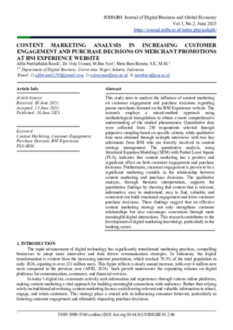 Alfin Nurfadhilah Ramli, Analisis Content Marketing Dalam Meningkatkan Customer Engagement dan Keputusan Pembelian Pada Promo Merchant di Website BNI Experience: Skripsi, Jakarta: Fakultas Ekonomi dan Bisnis Universitas Negeri Jakarta, 2025 Penelitian ini bertujuan untuk menganalisis pengaruh content marketing terhadap customer engagement dan keputusan pembelian pada promo merchant di website BNI Experience. Penelitian ini menggunakan pendekatan mixed method dengan teknik triangulasi metode untuk memberikan pemahaman yang lebih komprehensif terhadap fenomena yang dikaji. Data kuantitatif diperoleh dari 250 responden yang dipilih dengan teknik purposive sampling berdasarkan kriteria tertentu, sedangkan data kualitatif diperoleh melalui wawancara mendalam dengan dua informan kunci dari internal BNI yang terlibat dalam pengelolaan strategi konten. Analisis kuantitatif menggunakan teknik Structural Equation Modeling (SEM) berbasis Partial Least Square (PLS) menunjukkan bahwa content marketing berpengaruh positif dan signifikan terhadap customer engagement dan keputusan pembelian. Selain itu, customer engagement juga terbukti menjadi variabel mediasi yang signifikan dalam hubungan antara content marketing dan keputusan pembelian. Analisis kualitatif melalui pendekatan tematik mendukung hasil kuantitatif, yang menunjukkan bahwa konten yang relevan, informatif, mudah dipahami, mudah ditemukan, bernilai, dan konsisten mampu membangun keterlibatan emosional dan mendorong keputusan pembelian konsumen. Hasil ini menunjukkan bahwa strategi content marketing yang efektif tidak hanya memperkuat hubungan dengan nasabah, tetapi juga mendorong konversi melalui interaksi digital yang lebih bermakna. Penelitian ini memberikan kontribusi terhadap pengembangan ilmu pemasaran digital, khususnya dalam konteks perbankan. Kata kunci: Content Marketing, Customer Engagement, Keputusan Pembelian, Promo Merchant, BNI Experience.
