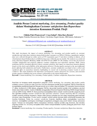 Chikita Putri Prameswari, 2025; Analisis Peran Content Marketing, Live Streaming, Product Quality dalam Meningkatkan Customer Satisfaction dan Repurchase Intention Konsumen Produk Thrift, S1 Bisnis Digital, Fakultas Ekonomi dan Bisnis, Universitas Negeri Jakarta, Tim Pembimbing: Prof. Usep Suhud, M.Si., Ph. D. & Meta Bara Berutu, S.E., M.M. Penelitian ini bertujuan untuk menganalisis pengaruh dari peran content marketing, live streaming, product quality dalam meningkatkan customer satisfaction dan repurchase intention konsumen produk thrift di platform TikTok. Pendekatan yang digunakan adalah kuantitatif, dengan motode survei yang disebarkan secara daring melalui Google Form. Sampel terdiri atas 270 responden yang memenuhi kriteria: berusia minimal 17 tahun, berdomisili di DKI Jakarta, pengguna aktif TikTok, dan telah melakukan pembelian setidaknya satu kali dalam enam bulan terakhir. Data dianalisis menggunakan Structural Equation Modeling (SEM) dengan bantuan software SPSS versi 26 dan AMOS versi 29. Hasil analisis menunjukkan bahwa seluruh hipotesis didukung dengan pengaruh yang positif dan signifikan. Meskipun content marketing dan live streaming terbukti mampu menarik minat konsumen, pengaruhnya terhadap repurchase intention sangat dipengaruhi oleh sejauh mana informasi yang diberikan bersifat jelas dan berkualitas. Sementara itu, product quality menjadi faktor yang paling dominan dalam memengaruhi kepuasan pelanggan dan niat beli ulang. Disamping itu, customer satisfaction terbukti secara langsung dan signifikan memengaruhi repurchase intention, memperkuat perannya sebagai elemen penting dalam membangun loyalitas konsumen. Kata Kunci: content marketing, live streaming, product quality, customer satisfaction, dan repurchase intention.